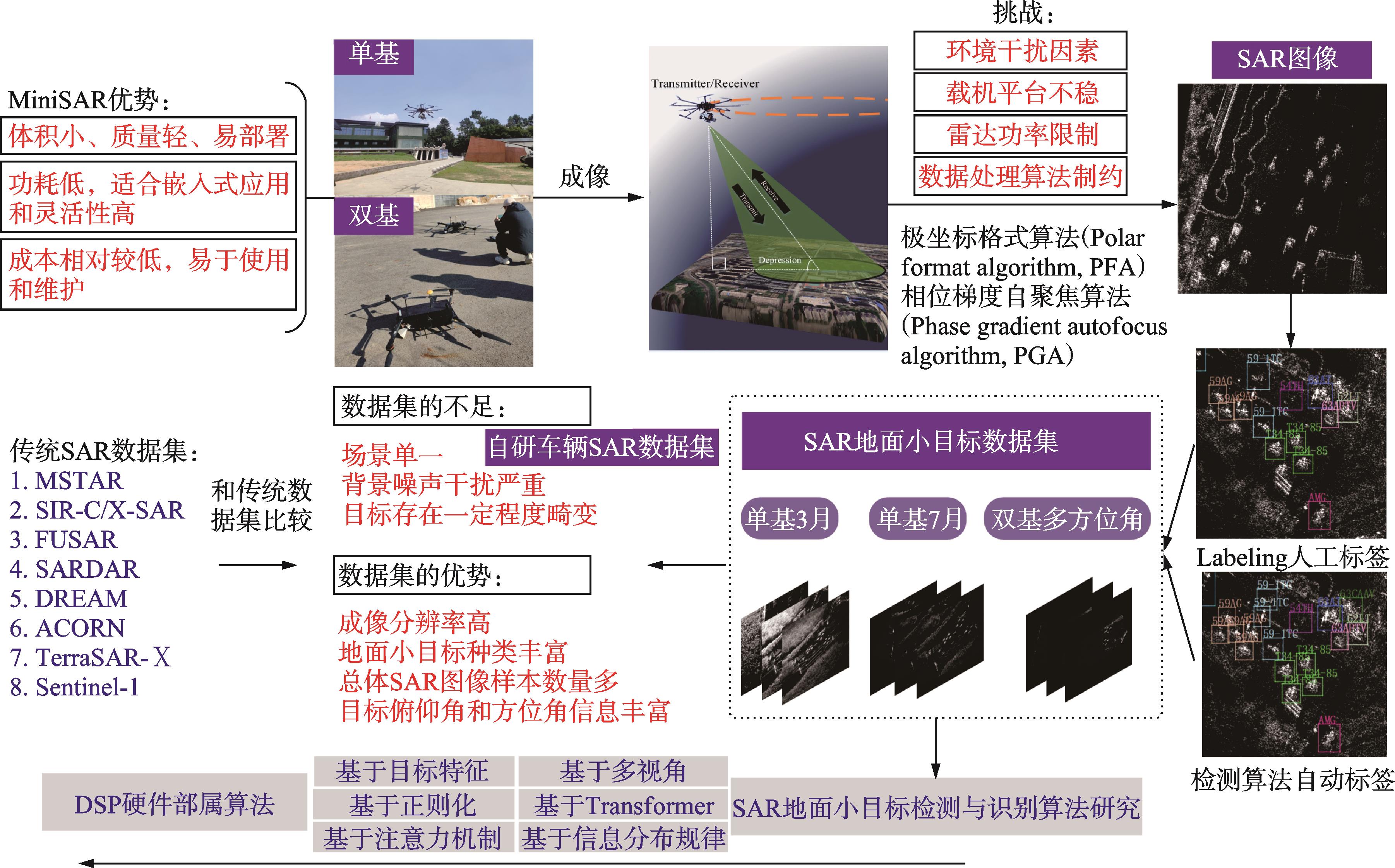 摘要:南京航空航天大学(Nanjing University of Aeronautics and Astronautics,NUAA)雷达探测与成像团队利用自主研发的无人机载微小型合成孔径雷达(Synthetic aperture radar,SAR)系统针对不同型号的坦克、装甲车和战机等十余类典型军事目标构建了圆周SAR数据集。通过对多次外场试验数据的高精度成像处理,在多俯仰角单基圆周SAR图像数据集的基础上,扩展了不同双基角组合的双基圆周SAR图像数据集。基于该数据集,本文结合团队在SAR图像目标检测和识别方法及应用方面的研究成果,对基于深度学习的SAR目标检测识别技术进行了回顾和综述,对比了不同神经网络模型在南航无人机载圆周SAR数据集上的检测和识别性能。具体地,在目标检测方面,利用SAR图像固有属性获得目标位置信息并结合单阶段轻量级检测算法,提出利用信息分布规律并结合全局注意力机制捕捉小目标位置信息的检测算法,以提高复杂背景下的小目标检测准确率和效率。在目标识别方面,在通过SAR图像先验信息抑制干扰噪声的基础上,提出利用SAR目标多视角信息联合Transformer的目标识别算法,通过设计视角正则化项以约束多视角之间的关联性从而实现不同视角间的特征融合,提高SAR小目标识别的准确率。从无人机载微型SAR系统对地面目标进行实时检测和识别的实际需求出发,本文还探讨了轻量化检测和识别网络在数字信号处理(Digital signal processing, DSP)平台上的部署方案,同时展示了初步试验结果。最后,本文展望了SAR目标智能检测和识别领域面临的挑战和发展趋势。