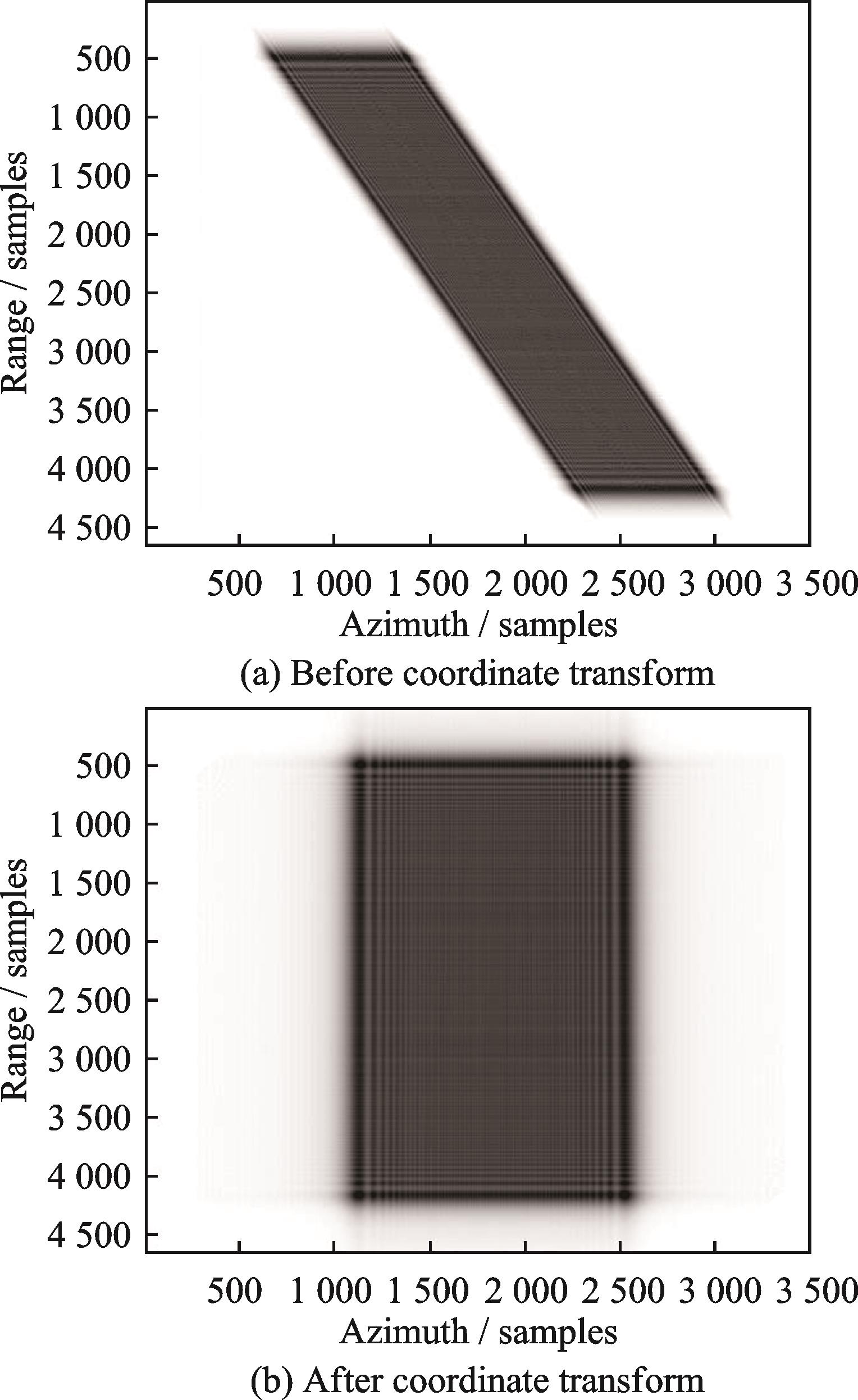 摘要:波数域成像算法(Wavenumber domain algorithm, WDA)采用了精确的信号形式和距离徙动校正方法,在合成孔径雷达(Synthetic aperture radar, SAR) 斜视数据处理中具有精度高等优势。然而,在大斜视情况下,传统WDA不能充分利用倾斜的二维频谱支撑域,导致目标聚焦效果差。本文提出了一种全新基于坐标变换的大斜视SAR波数域成像算法。该算法首先将SAR回波数据变换到二维频域,通过参考函数相乘(Reference function multiply, RFM)完成对数据的一致压缩;然后,基于坐标变换原理将倾斜的频谱转化为正侧视频谱实现频谱的高利用;最后构建改进的Stolt插值因子,完成补余压缩。与传统波数域算法相比,所提方法不仅有效校正了倾斜的频谱支撑域,保证了成像质量,且其重构的点目标脉冲响应函数(Impulse response function, IRF)的距离向和方位向剖面正交,便于分辨率的计算与剖面的精确提取。通过对多组仿真和实测实验结果分析,证明了本文方法的有效性和优越性。