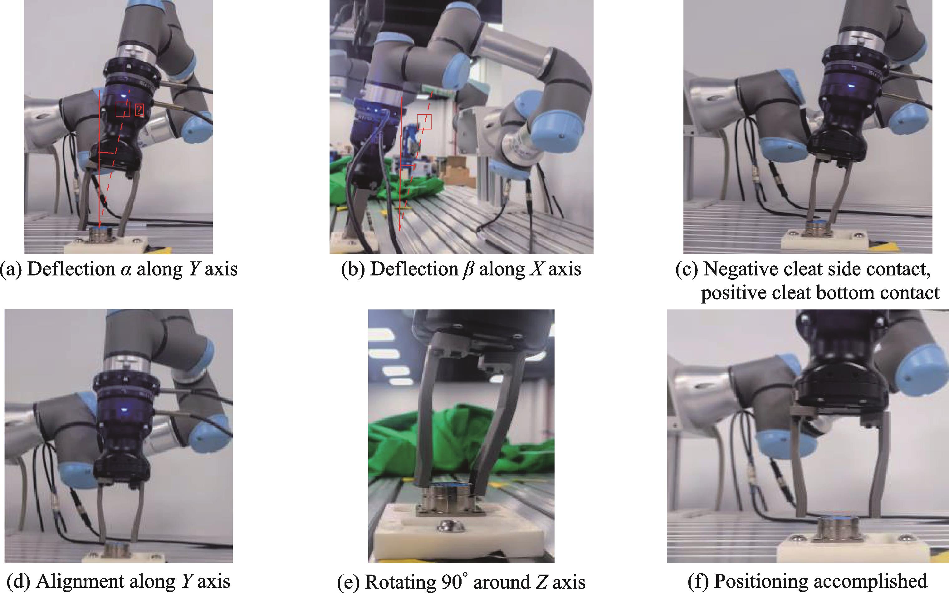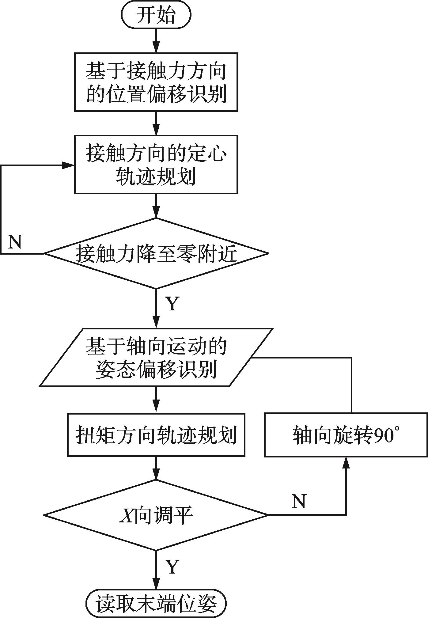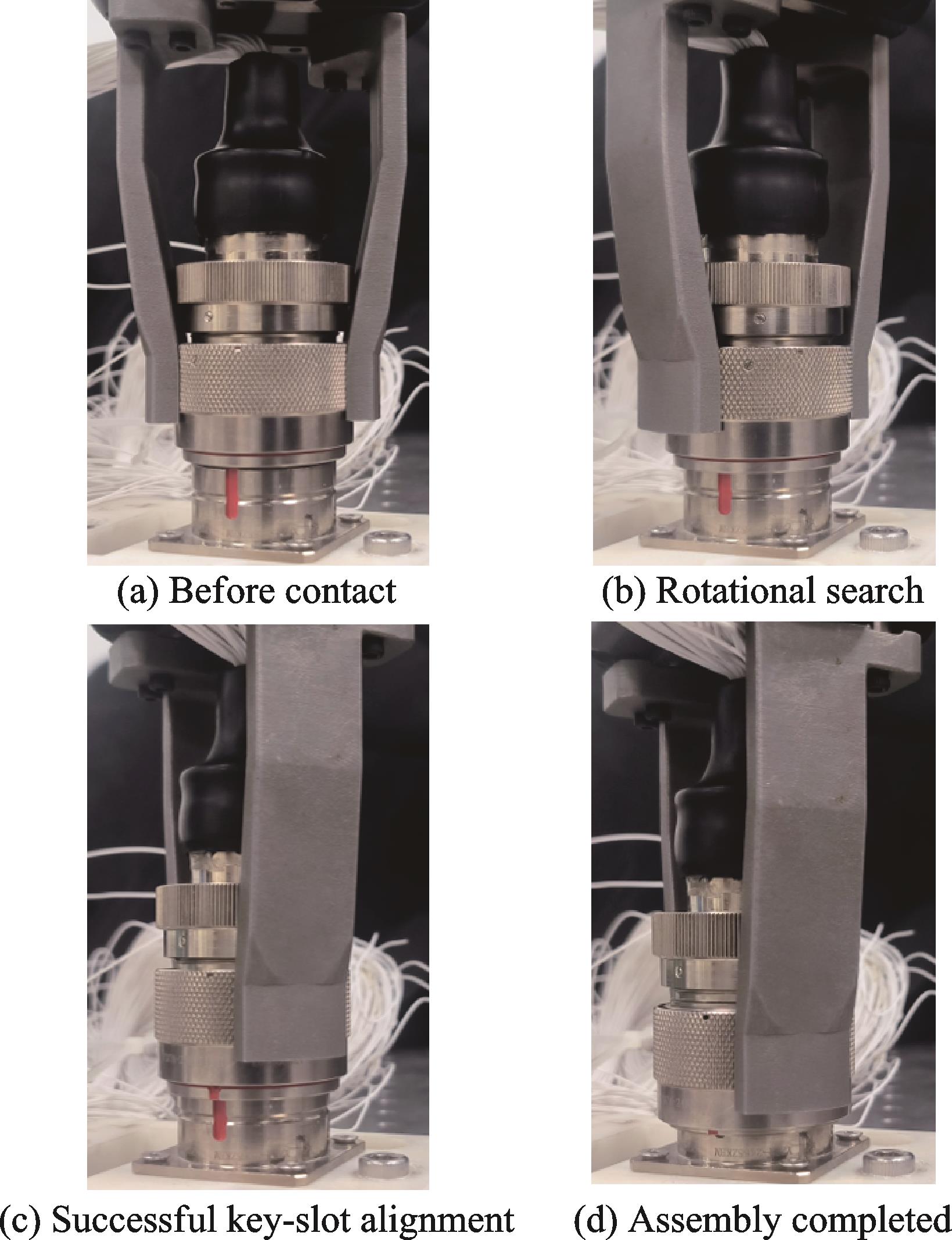 摘要:为解决航天电连接器自动装配过程中存在的视觉受限、针孔卡阻等问题,提出了基于插座外轮廓接触力反馈的自动装配技术,用于实现圆形航天电连接器的装配作业。结合电连接器在夹持状态下的受力分析,构建了基于“位置定心-姿态调平-旋转接入”的3阶段装配方法。首先,通过识别夹板与插座的接触象限来实现插座外轮廓的中心定位。其次,基于末端夹爪轴向运动前后接触力的变化来判断初始姿态偏转,并引导机器人沿扭矩方向实现自适应姿态调整。最后,采用旋转搜索算法完成电连接器接入,并在多组初始偏转误差条件下进行了多次实验,验证了所提方法的有效性。