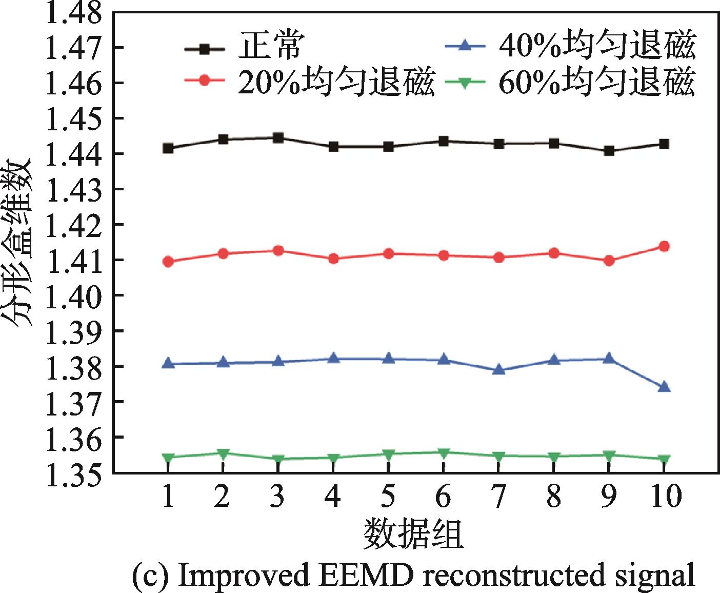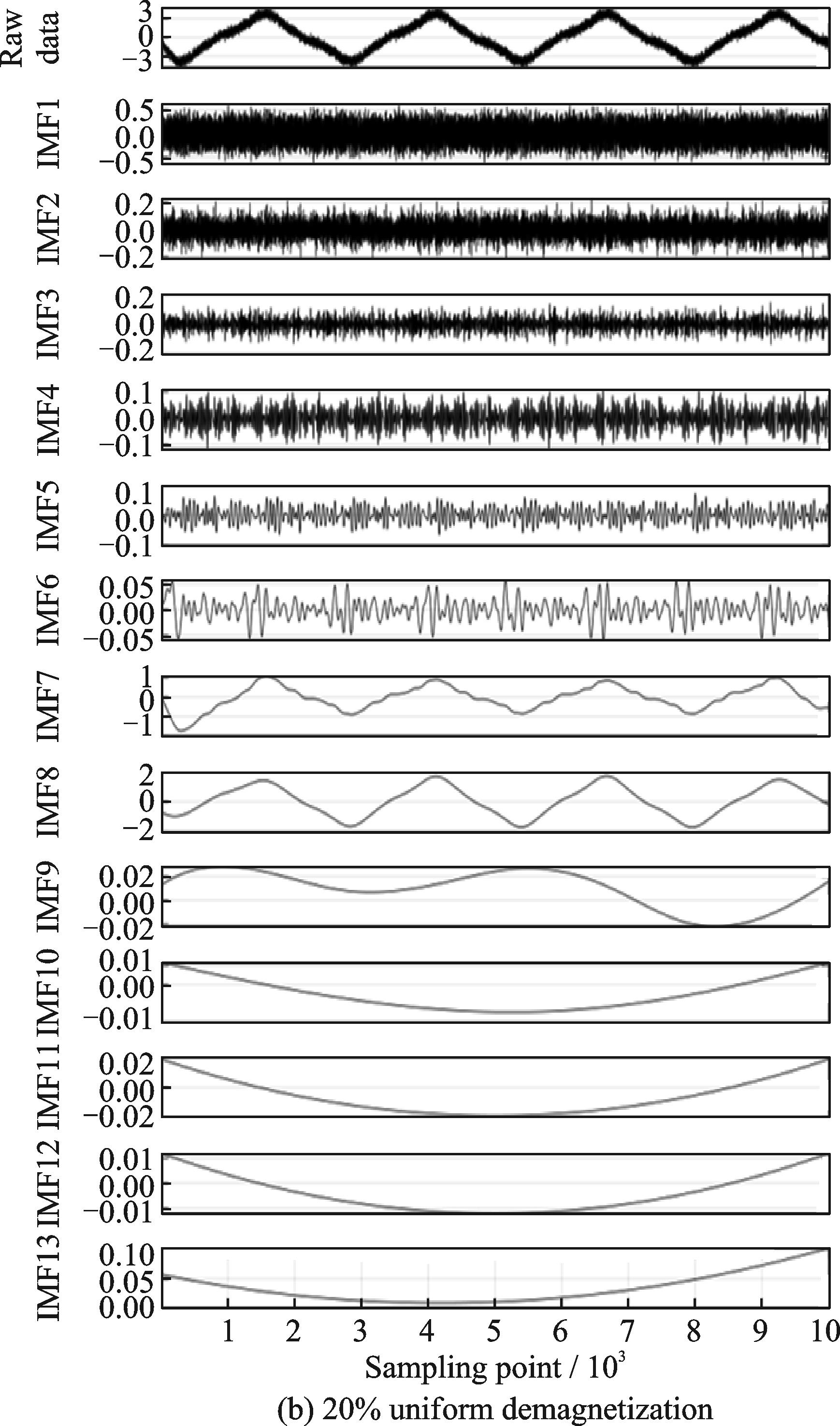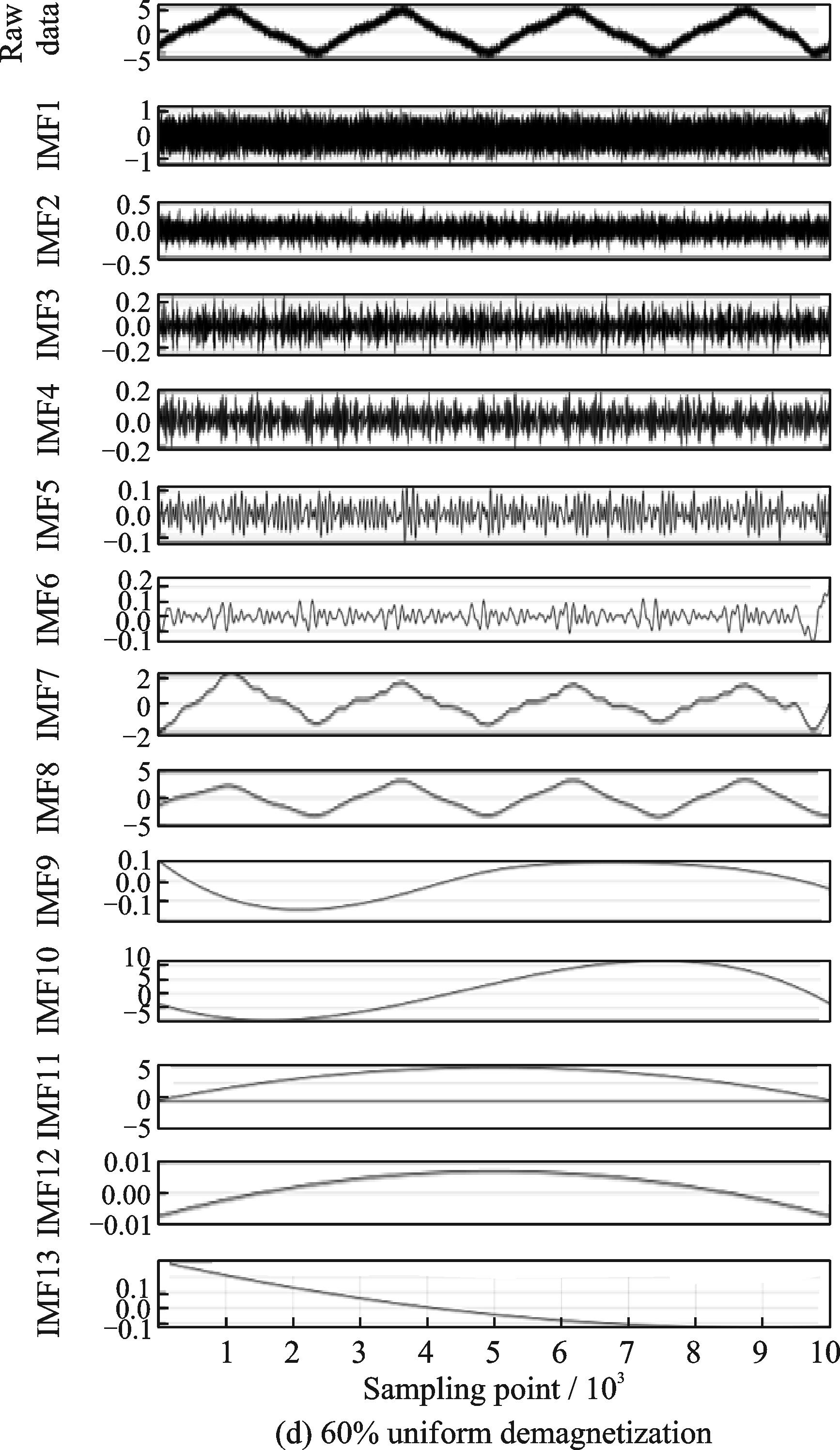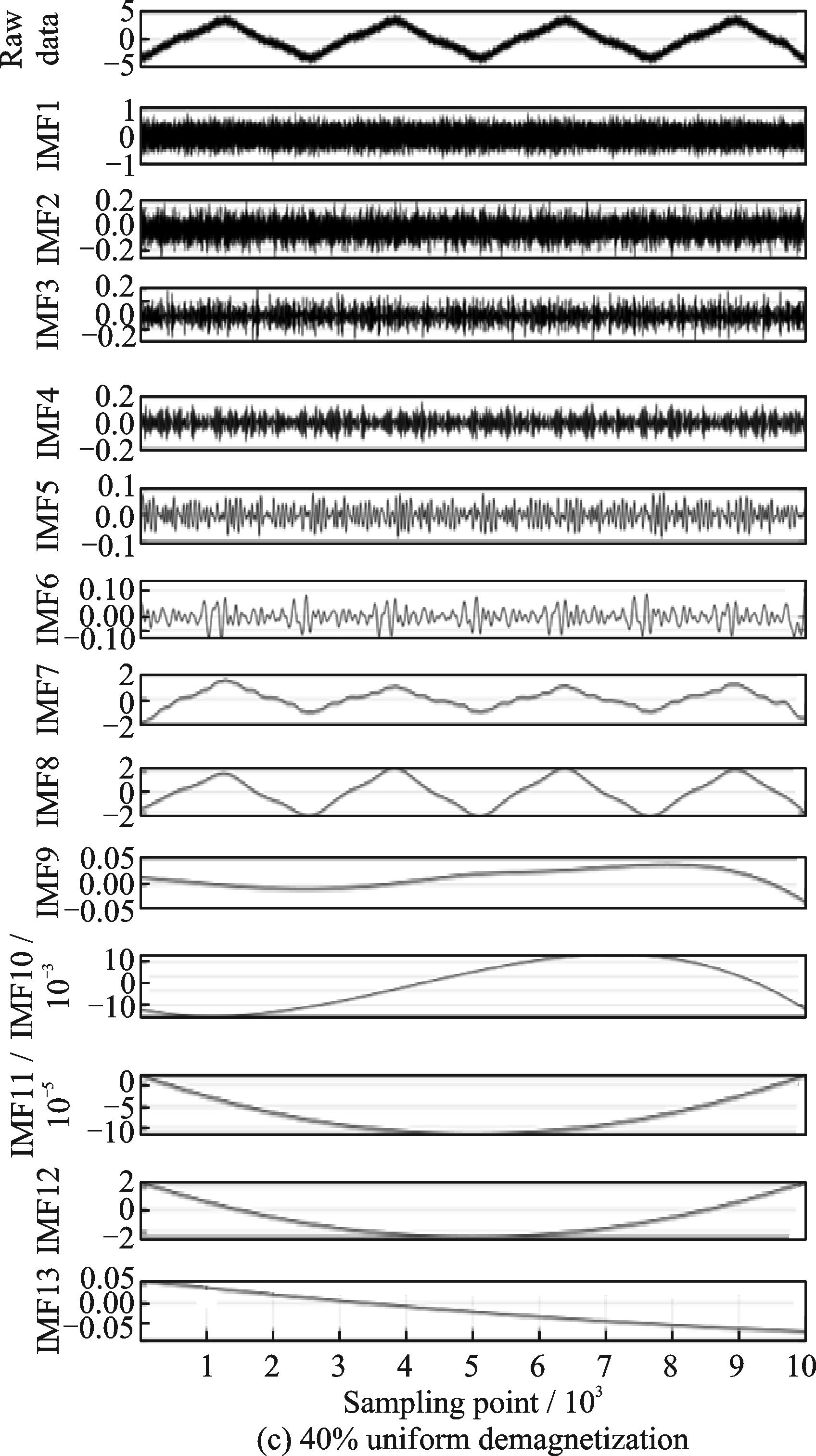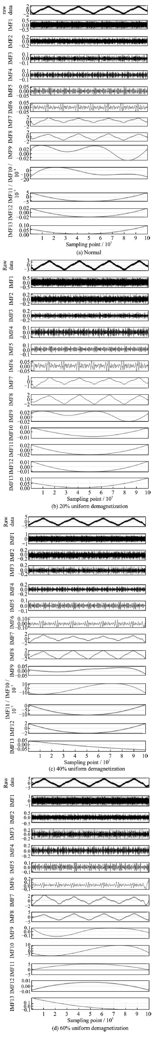 摘要:基于电流信号提供了一个新的不同均匀退磁程度的故障诊断方法,研究了永磁同步电机(Permanent magnet synchronous motors,PMSMs)的均匀退磁故障诊断方法。提出了一种基于改进的集合经验模式分解(Ensemble empirical mode decomposition,EEMD)算法和粒子群优化-支持向量机(Particle swarm optimization-support vector machine,PSO-SVM)的故障诊断方法。首先利用改进EEMD对采集的定子电流信号进行降噪和重构。其次计算处理后数据的分形盒维数作为故障特征参数。最后通过PSO-SVM处理特征参数诊断均匀退磁故障。通过解析模型仿真实验和原型实验表明,该方法能准确识别永磁同步电机均匀退磁故障,平均识别率超过96%,证明了本文故障诊断方法的有效性。