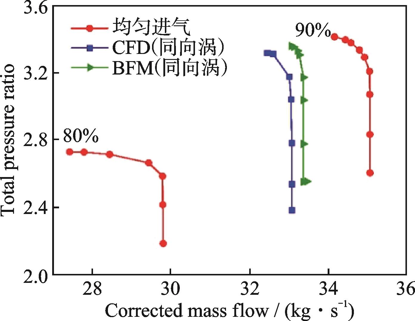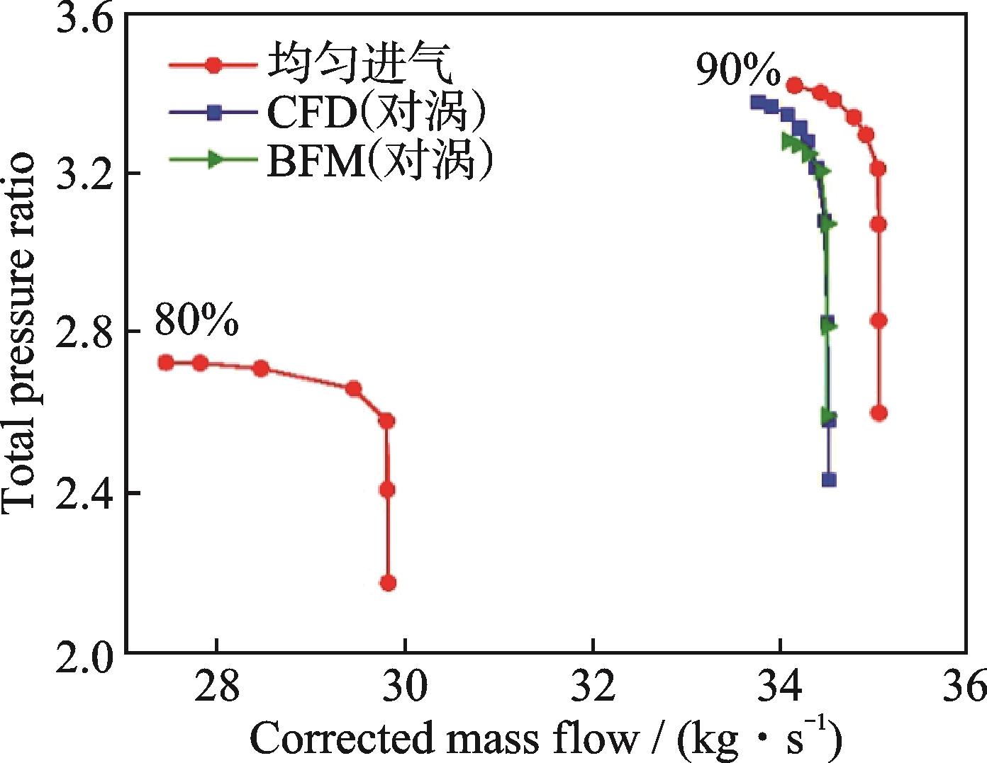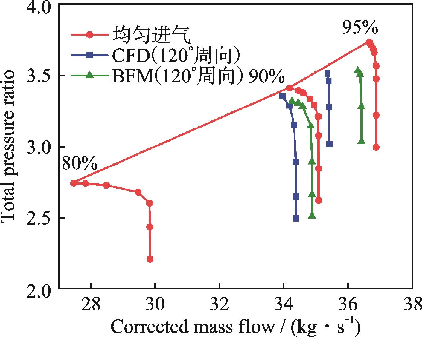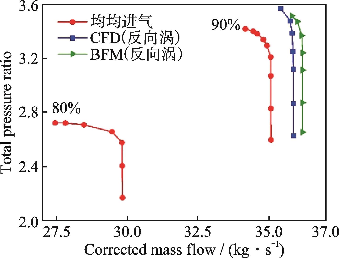 摘要:采用三维彻体力模型(Body force model, BFM)和计算流体力学(Computational fluid dynamics, CFD)两种计算方法研究周向总压畸变及不同旋流畸变类型对跨音三级风扇性能和稳定性的影响,并探究畸变传递特性及风扇内部流场特征。结果表明:BFM和CFD计算结果吻合良好;均匀进气下BFM和CFD计算特性最大误差不超过4%;120°周向总压畸变使风扇性能下降,稳定边界向下移动;轴向历程中,总压畸变强度整体递减,而总温畸变强度整体递增;同向涡旋流畸变使风扇压比下降,失速延迟,而反向涡旋流畸变对风扇的影响与之相反;对涡旋流中由于同向涡占主导地位,导致风扇压比特性低于均匀进气和反向涡旋流畸变,其特性线的变化与同向涡旋流畸变类似;对涡旋流畸变诱导了总压和总温畸变,而后经过各级的衰减作用,畸变强度整体呈衰减趋势。