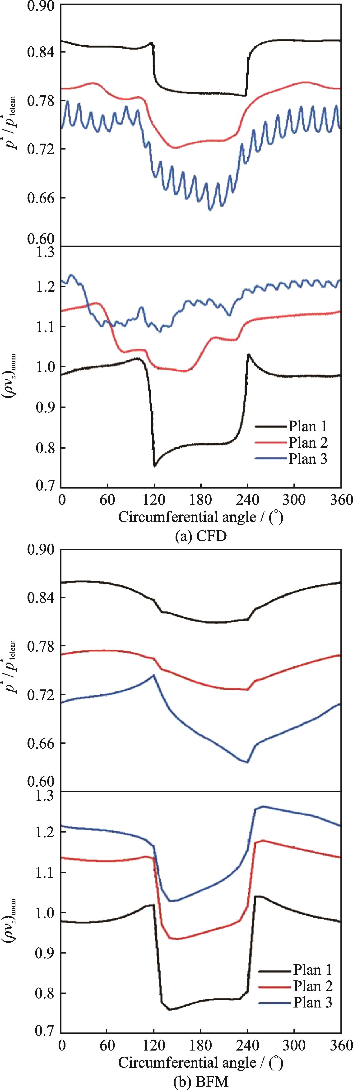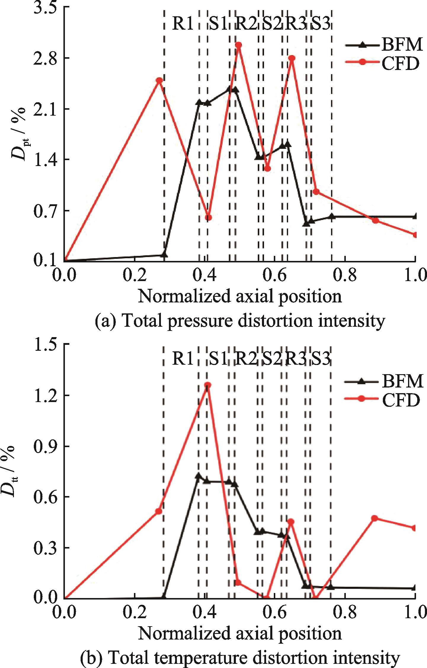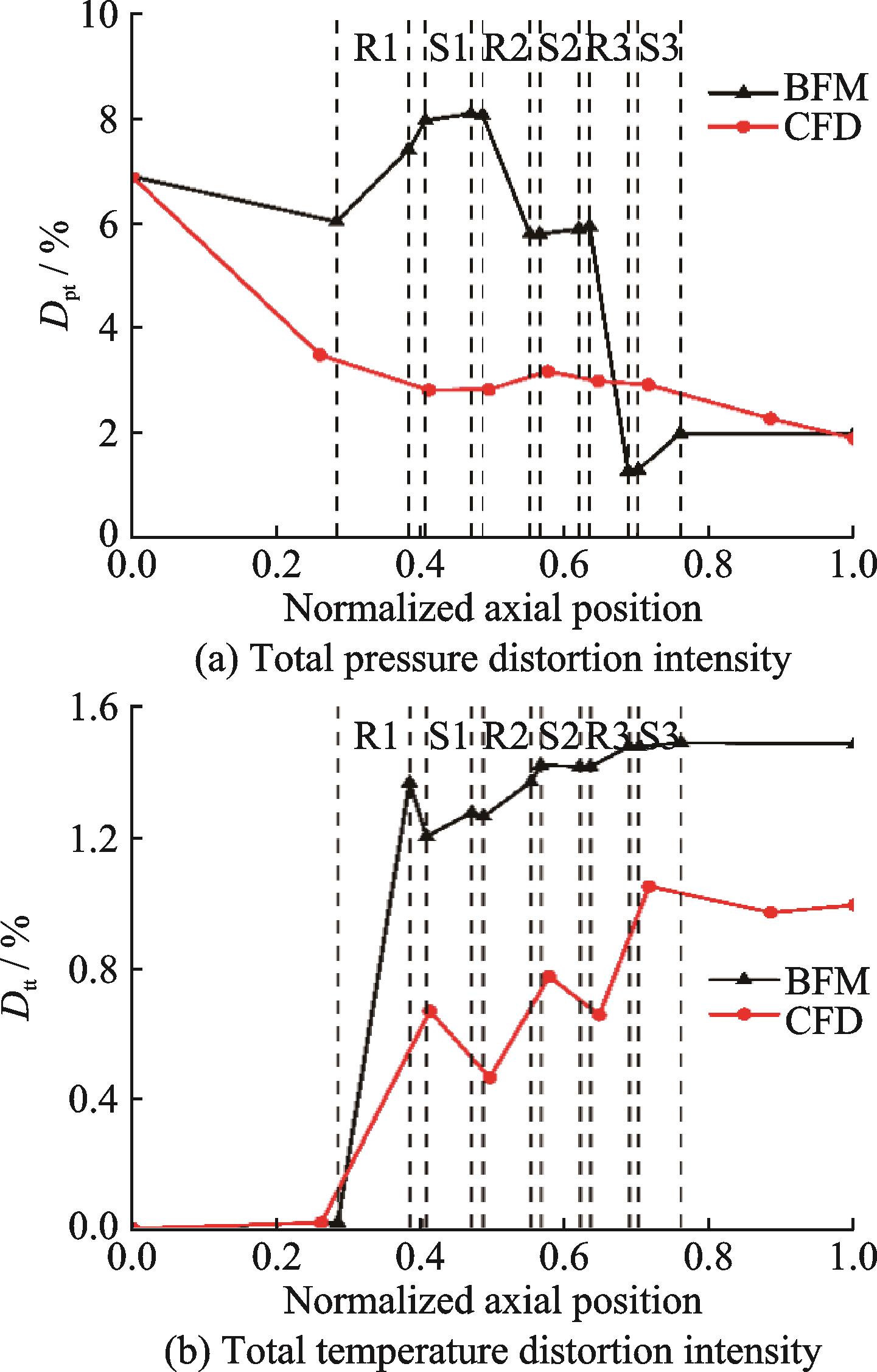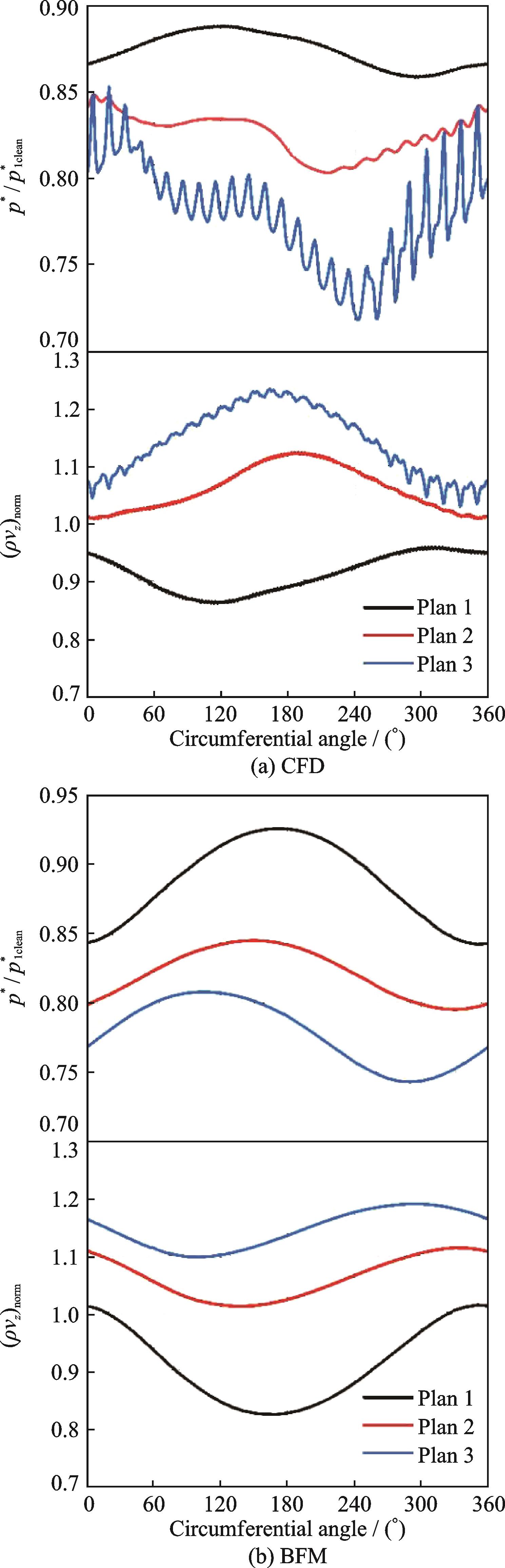 摘要:采用三维彻体力模型(Body force model, BFM)和计算流体力学(Computational fluid dynamics, CFD)两种计算方法研究周向总压畸变及不同旋流畸变类型对跨音三级风扇性能和稳定性的影响,并探究畸变传递特性及风扇内部流场特征。结果表明:BFM和CFD计算结果吻合良好;均匀进气下BFM和CFD计算特性最大误差不超过4%;120°周向总压畸变使风扇性能下降,稳定边界向下移动;轴向历程中,总压畸变强度整体递减,而总温畸变强度整体递增;同向涡旋流畸变使风扇压比下降,失速延迟,而反向涡旋流畸变对风扇的影响与之相反;对涡旋流中由于同向涡占主导地位,导致风扇压比特性低于均匀进气和反向涡旋流畸变,其特性线的变化与同向涡旋流畸变类似;对涡旋流畸变诱导了总压和总温畸变,而后经过各级的衰减作用,畸变强度整体呈衰减趋势。