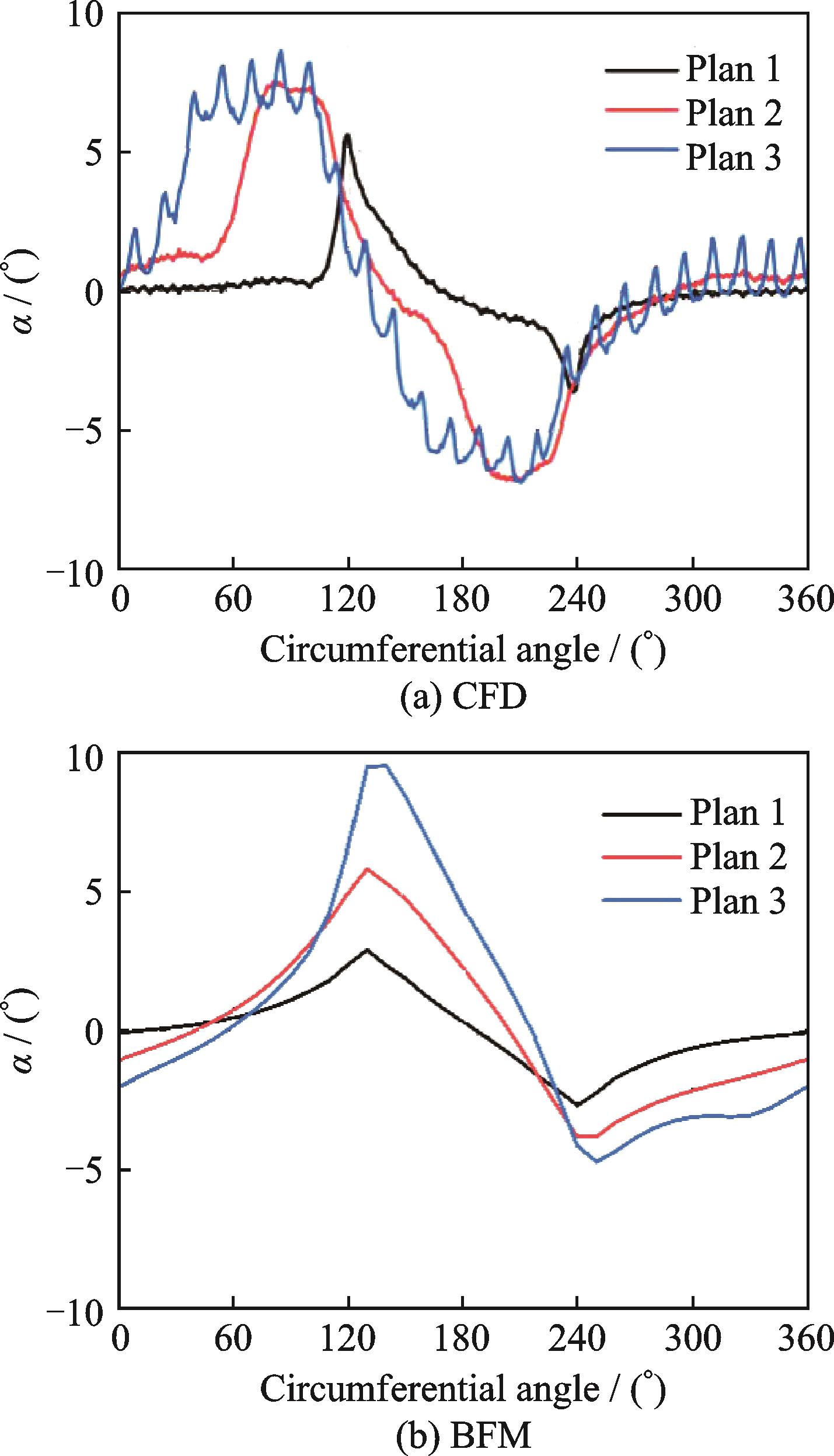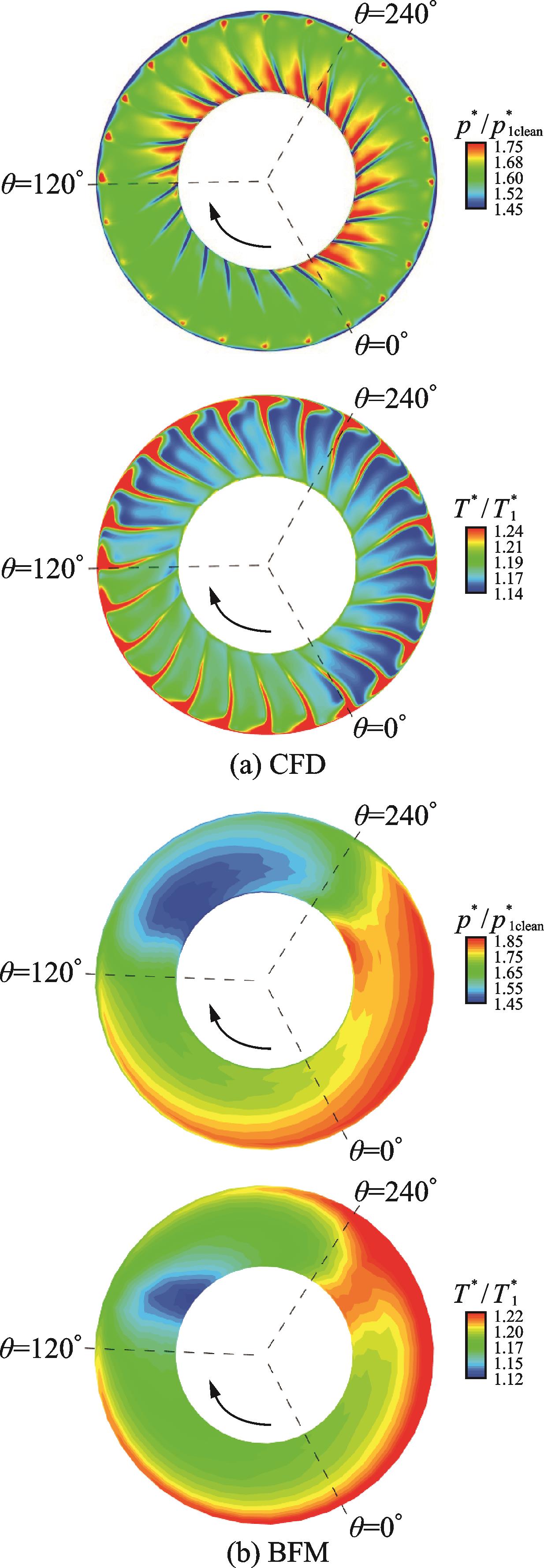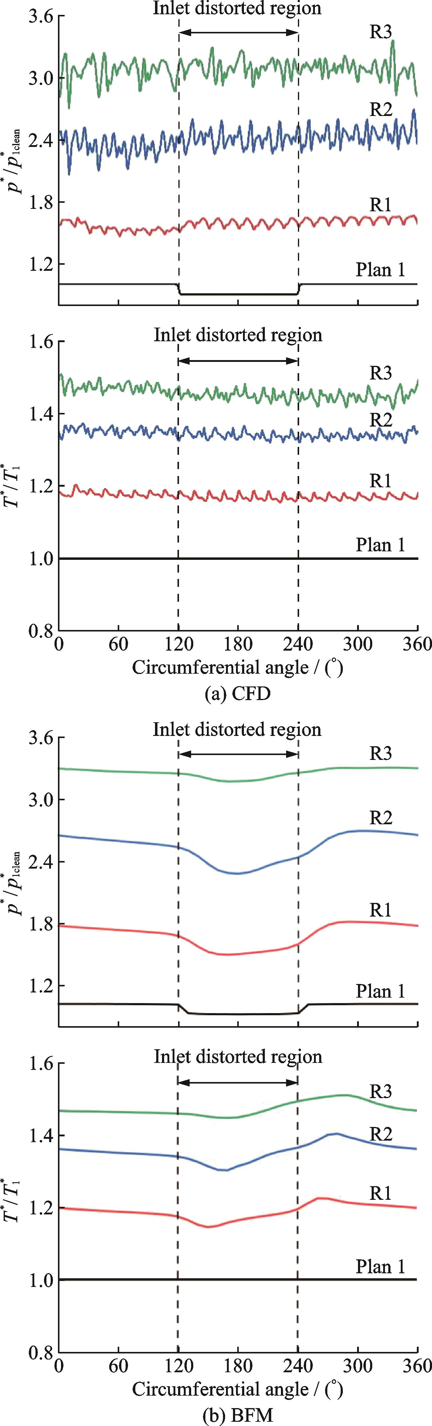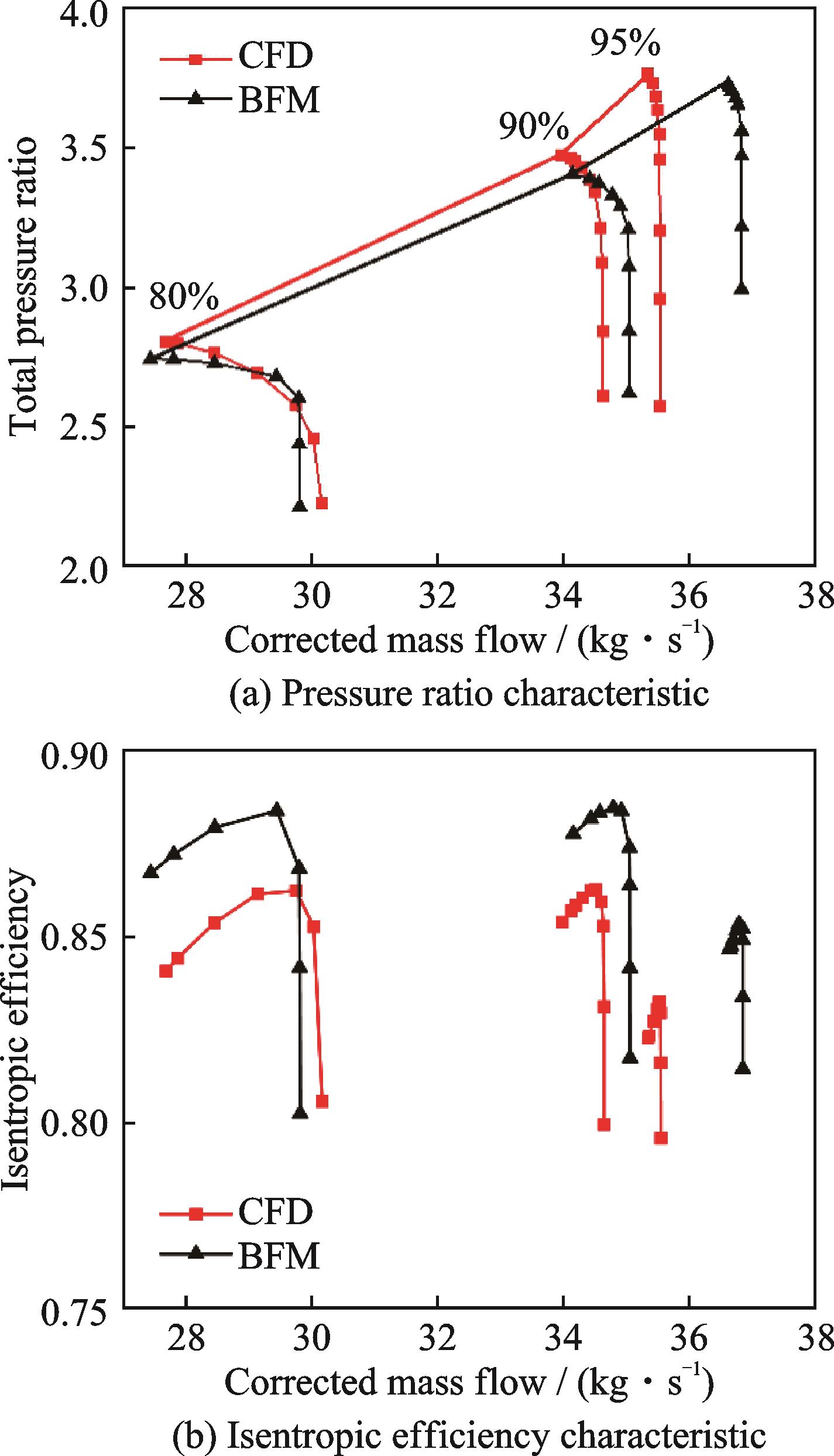 摘要:采用三维彻体力模型(Body force model, BFM)和计算流体力学(Computational fluid dynamics, CFD)两种计算方法研究周向总压畸变及不同旋流畸变类型对跨音三级风扇性能和稳定性的影响,并探究畸变传递特性及风扇内部流场特征。结果表明:BFM和CFD计算结果吻合良好;均匀进气下BFM和CFD计算特性最大误差不超过4%;120°周向总压畸变使风扇性能下降,稳定边界向下移动;轴向历程中,总压畸变强度整体递减,而总温畸变强度整体递增;同向涡旋流畸变使风扇压比下降,失速延迟,而反向涡旋流畸变对风扇的影响与之相反;对涡旋流中由于同向涡占主导地位,导致风扇压比特性低于均匀进气和反向涡旋流畸变,其特性线的变化与同向涡旋流畸变类似;对涡旋流畸变诱导了总压和总温畸变,而后经过各级的衰减作用,畸变强度整体呈衰减趋势。