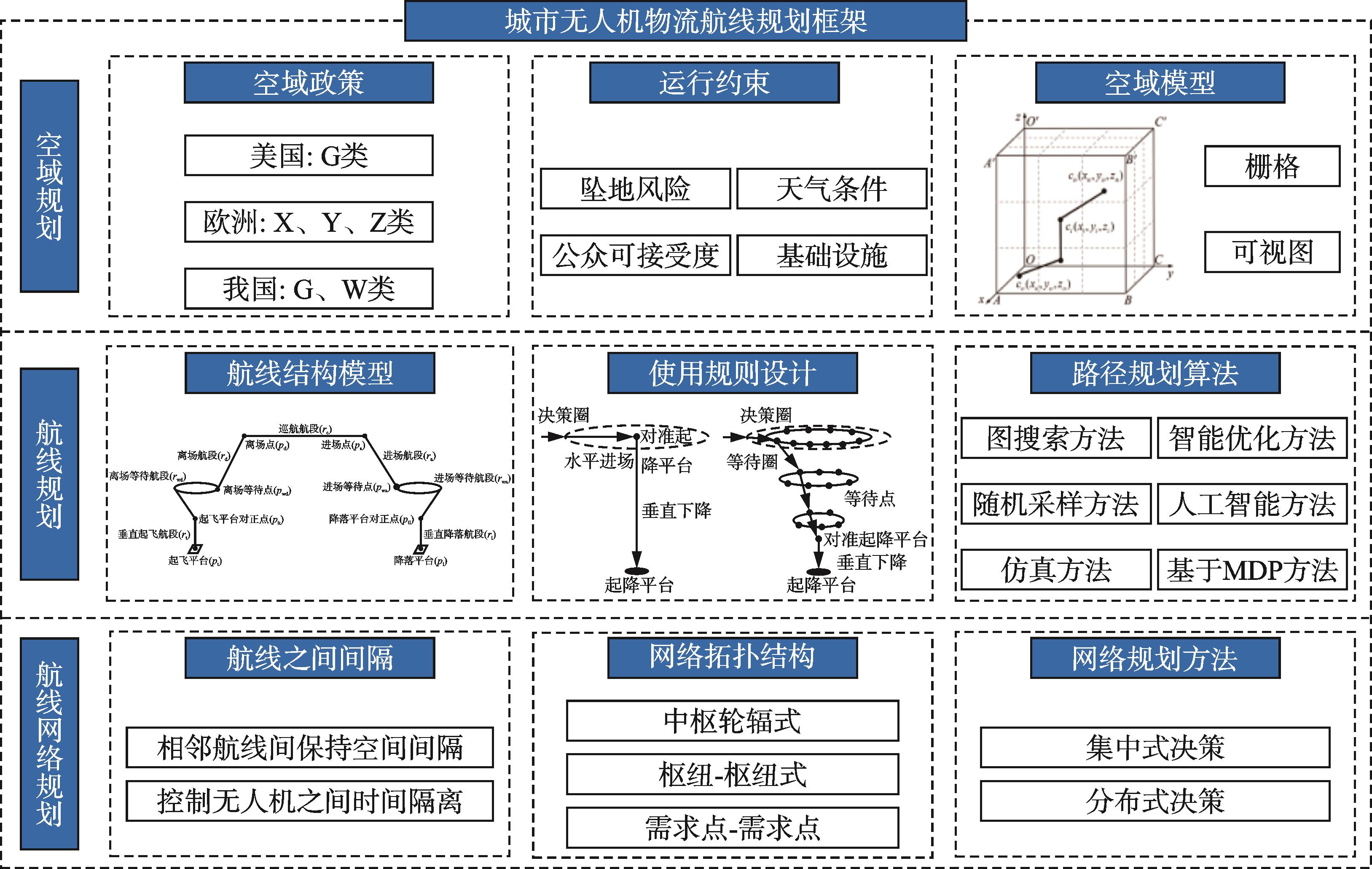 摘要:随着近几年城市物流无人机运输快速发展,旋翼无人机凭借垂直起降、灵活机动的特性,已在多个城市形成覆盖范围广、运行模式多样的航线网络。然而,城市低空空域受制于高层建筑物、复杂地形及动态风场等限制因素,同时还面临通信中断与公众可接受度低等现实挑战,这些使得科学的航线规划成为保障运行安全与效率的关键环节。首先,梳理了国内主要运营人航线设计方案,提炼出物流航线各功能航段在空间布局与衔接顺序上的基本特征,定义了物流航线结构参数化模型。其次,通过文献调研归纳出坠地风险、天气条件、公众可接受度、基础设施等航线规划影响要素,以及空中航线与进离场航线主要规划方法及其适用性与优缺点。最后,综合形成包含空域、航线、航线网络的,涵盖空中航线和进离场航线的一体化的物流航线规划框架。本文研究成果将为后续理论研究和实践运行提供方法论层面的指导。