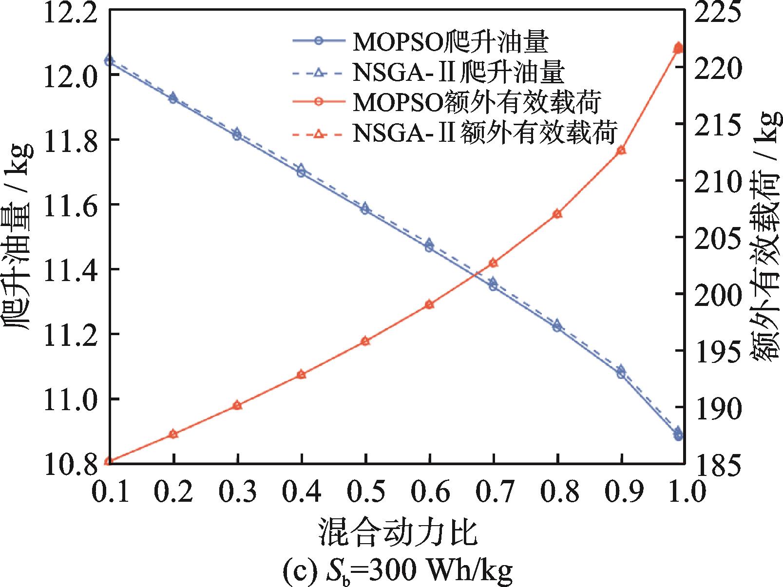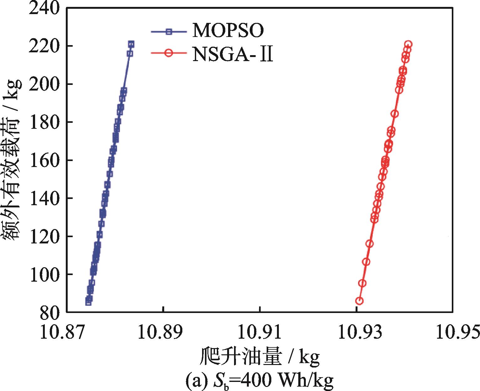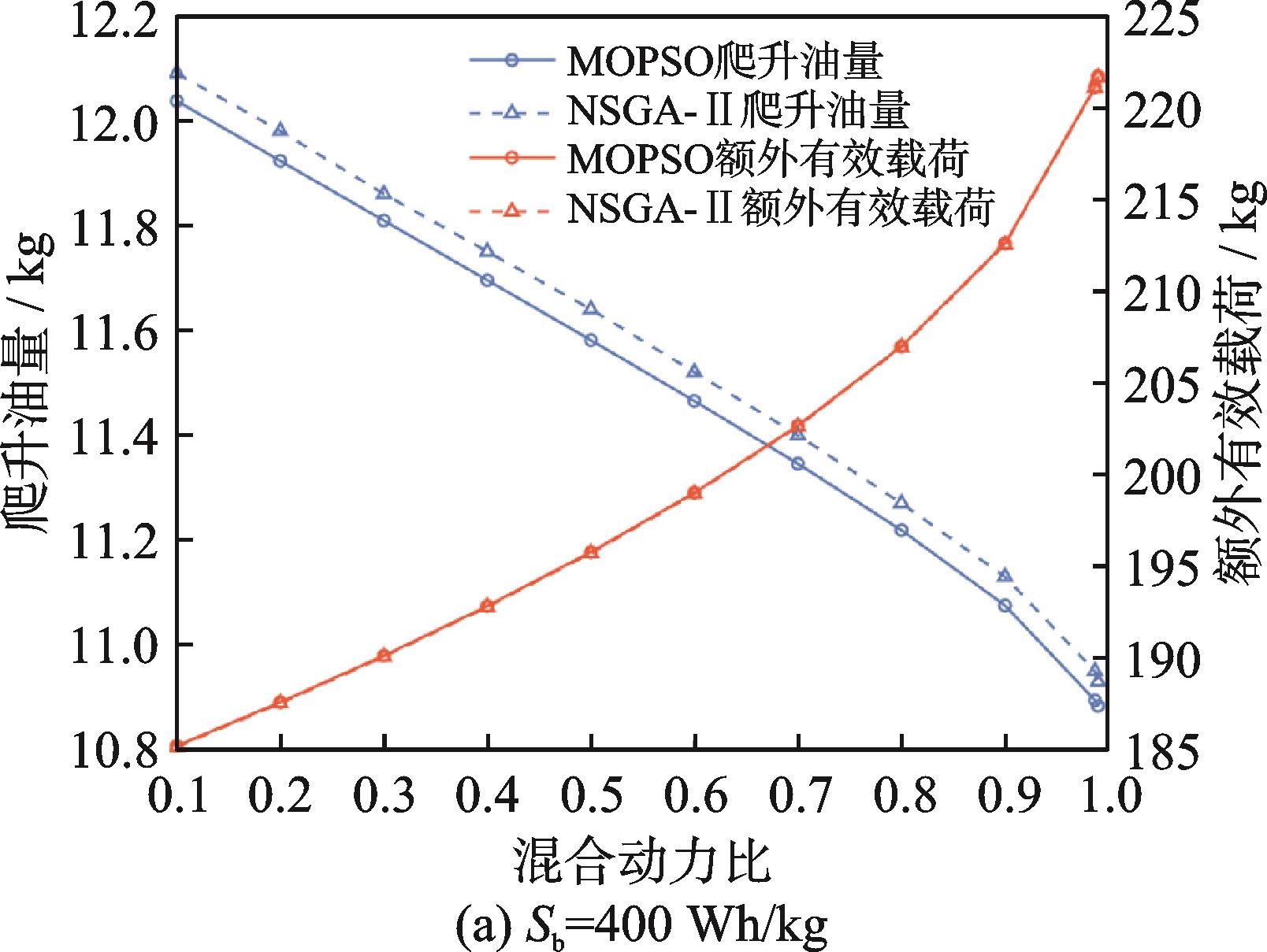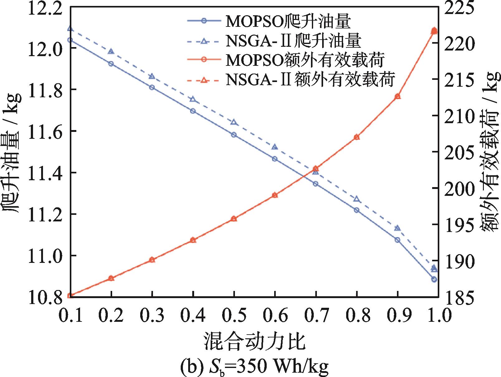 摘要:为了分析混合动力比和电动机数量对小型混合动力飞机爬升性能的影响,以及爬升阶段不同性能参数的选择。根据小型混合动力飞机气动模型和串联结构系统模型,以混合动力比、爬升速度、爬升角、电动机数量和起飞质量作为优化变量,以爬升油量和额外有效载荷作为目标函数,建立混合动力飞机爬升性能优化模型。分别采用多目标粒子群算法和非支配排序遗传算法对某型混合动力飞机进行优化求解和对比分析,并将两种算法的优化结果与国外研究结果进行对比,证明了优化结果的有效性。优化结果表明:两种优化算法对减少飞机爬升油量和增加额外有效载荷均有良好的优化效果。要实现爬升油量最小和额外有效载荷最大的目标需满足:混合动力比为0.99,爬升速度为51 m/s,爬升角为7 °,起飞质量在1 830 kg至2 200 kg之间。