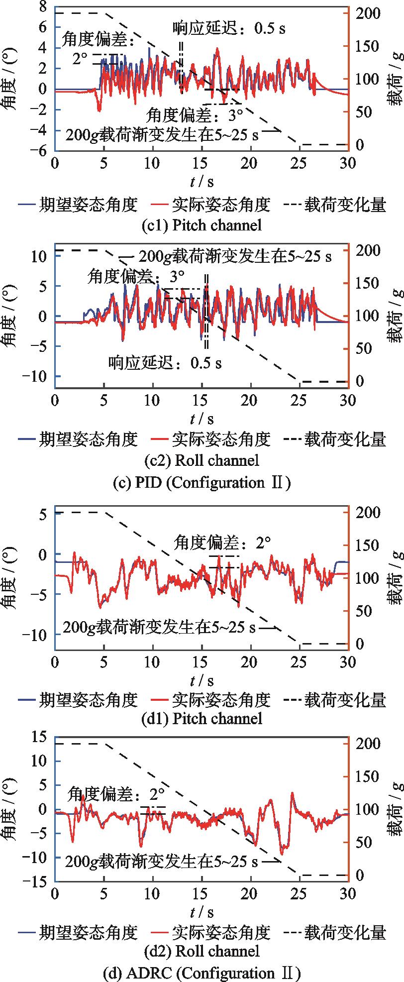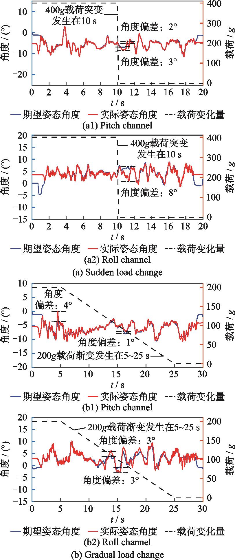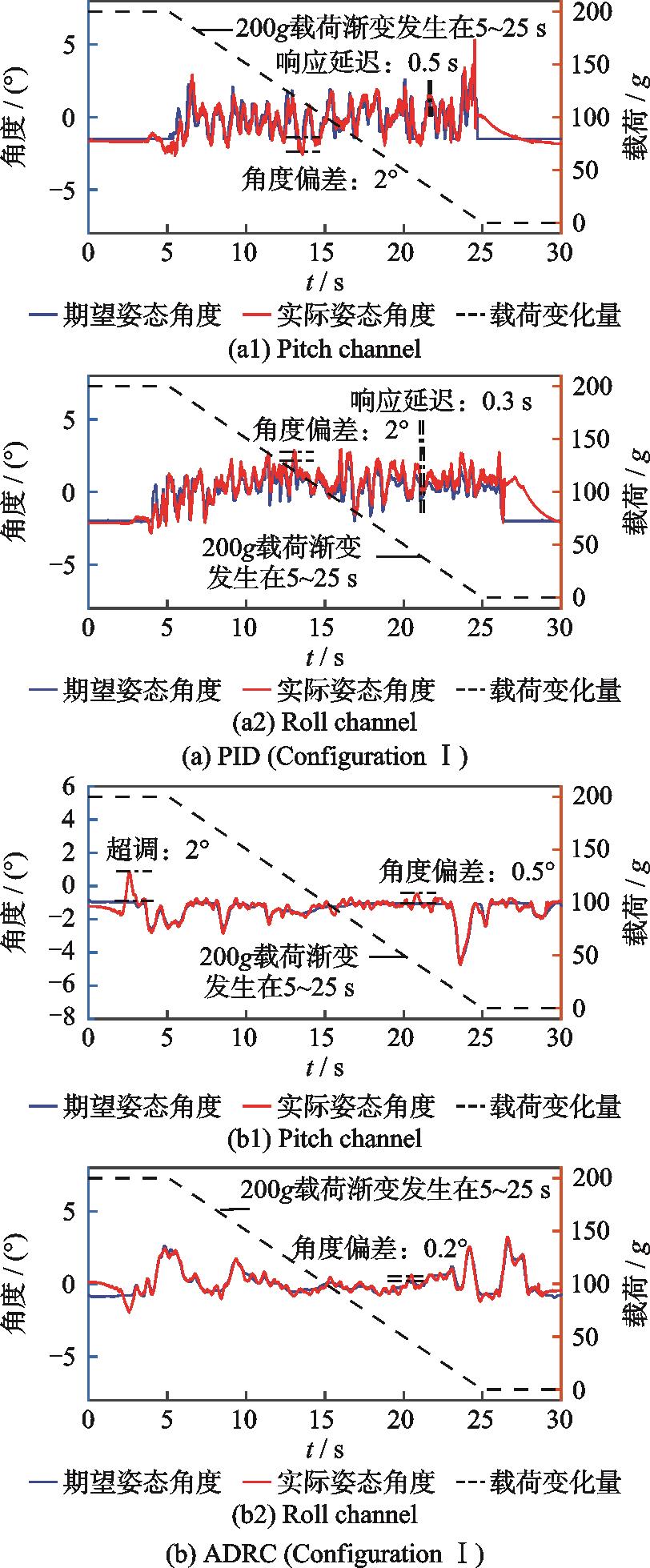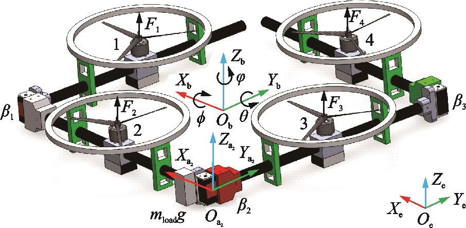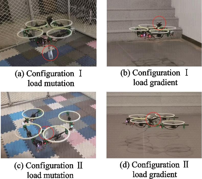 摘要:链式变体旋翼飞行器具有良好的拟态运动条件,但其带载作业易受载荷变化而引起飞行姿态控制稳定问题。为此,本文设计了一种基于自抗扰控制技术(Active disturbance rejection control,ADRC)的飞行器变载荷姿态控制方法。首先,面向变载荷的变体旋翼飞行器构建了动力学模型,分析了载荷变化对飞行器姿态控制的影响;其次,将状态间耦合、载荷变化、内外扰动统一为总扰动,引入扩张状态观测器(Extended state observer, ESO)实现对扰动的跟踪和估计;最后,对飞行器典型构态姿态控制的稳定性、载荷渐变和骤变情况下的姿态控制可行性进行了实飞验证,对比分析了PID与ADRC两种控制器在变载荷姿态控制中的适用性,并进一步分析了变载荷条件下构态转换对飞行器姿态扰动的影响。结果表明,飞行器姿态各轴向角度跟踪偏差最大不超出8°,最大响应时延不超过0.3 s。基于ADRC的变体旋翼飞行器姿态控制体现了良好的稳定性和鲁棒性,为变体旋翼飞行器带载作业能力构建提供了技术参考。