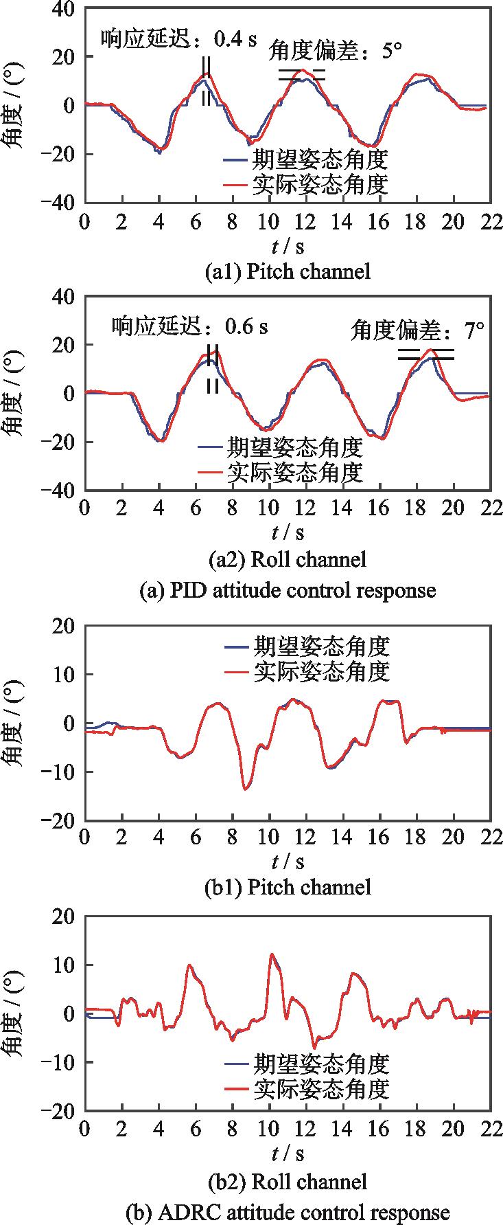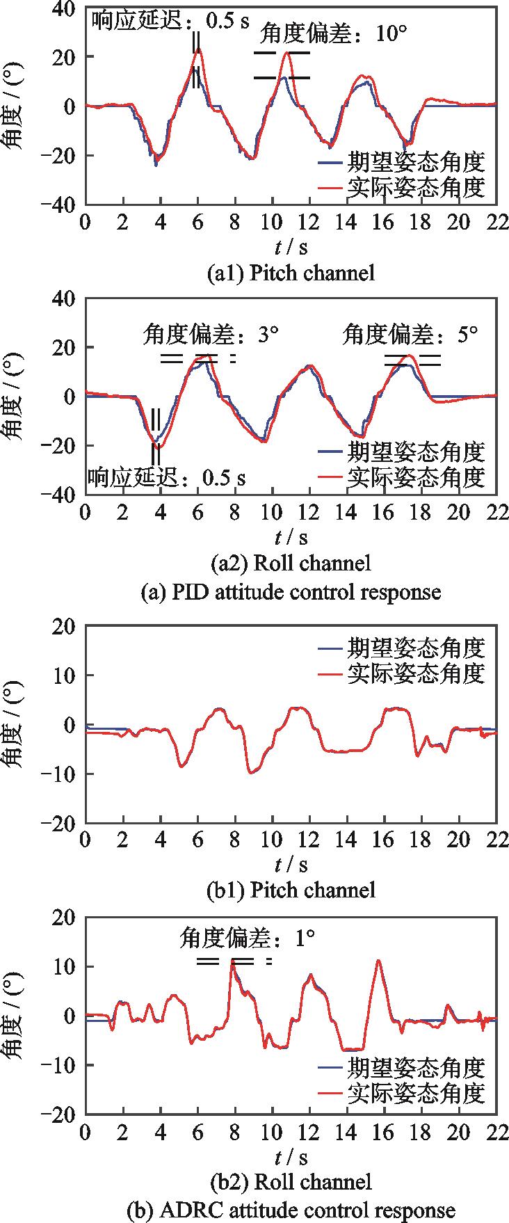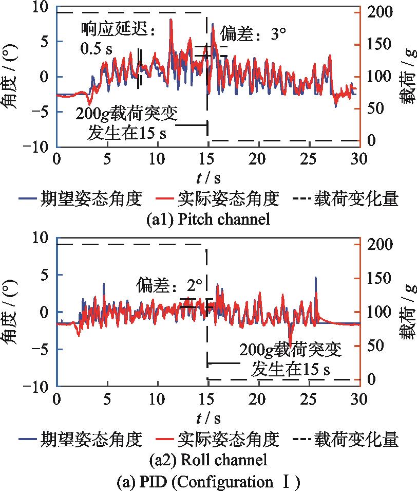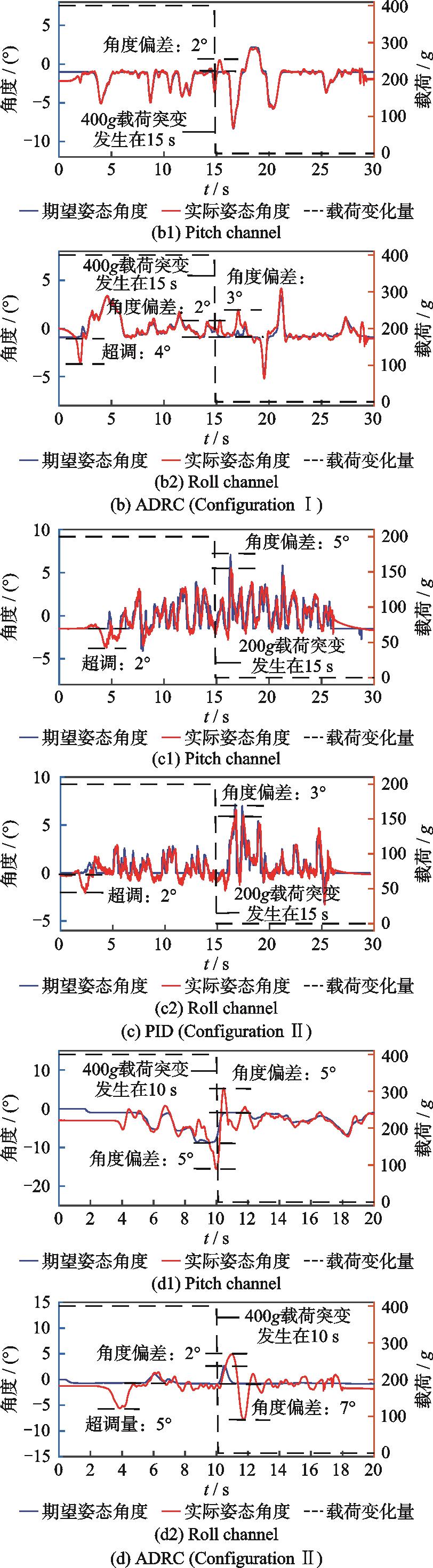 摘要:链式变体旋翼飞行器具有良好的拟态运动条件,但其带载作业易受载荷变化而引起飞行姿态控制稳定问题。为此,本文设计了一种基于自抗扰控制技术(Active disturbance rejection control,ADRC)的飞行器变载荷姿态控制方法。首先,面向变载荷的变体旋翼飞行器构建了动力学模型,分析了载荷变化对飞行器姿态控制的影响;其次,将状态间耦合、载荷变化、内外扰动统一为总扰动,引入扩张状态观测器(Extended state observer, ESO)实现对扰动的跟踪和估计;最后,对飞行器典型构态姿态控制的稳定性、载荷渐变和骤变情况下的姿态控制可行性进行了实飞验证,对比分析了PID与ADRC两种控制器在变载荷姿态控制中的适用性,并进一步分析了变载荷条件下构态转换对飞行器姿态扰动的影响。结果表明,飞行器姿态各轴向角度跟踪偏差最大不超出8°,最大响应时延不超过0.3 s。基于ADRC的变体旋翼飞行器姿态控制体现了良好的稳定性和鲁棒性,为变体旋翼飞行器带载作业能力构建提供了技术参考。