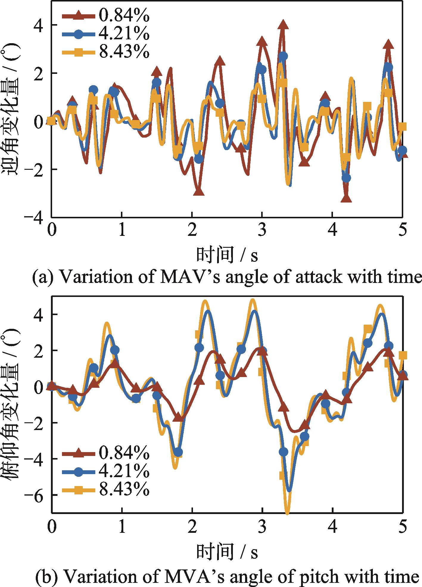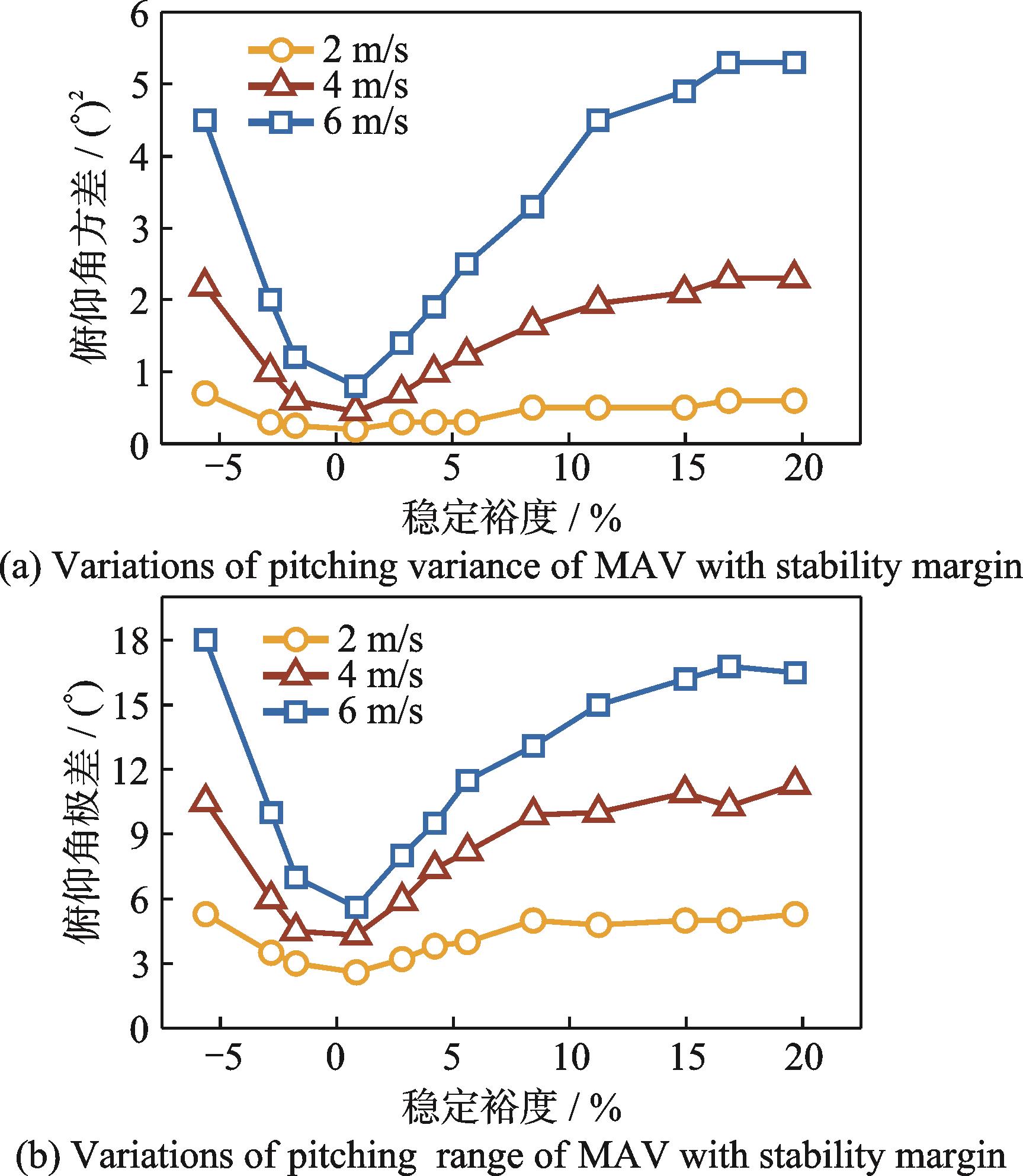 摘要:固定翼微型飞行器(Micro air vehicle, MAV)速度低、转动惯量小,飞行过程中在大气扰动下迎角易发生较大变化,俯仰角又会在迎角恢复力矩作用下振荡,纵向静稳定性对MAV的俯仰姿态控制品质有一定的影响。为了提高MAV的俯仰姿态控制品质,本文首先提出了一种不同纵向静稳定性下MAV俯仰姿态控制品质的评估方法,该方法定义俯仰角振荡过程中的方差与极差来表征俯仰姿态控制品质,之后以控制品质最优为目标分别对不同静稳定性下MAV飞行姿态控制系统的控制参数进行调整。通过研究不同静稳定性下的最优控制品质变化规律,获得MAV纵向静稳定性对俯仰姿态控制品质的影响。结果表明,俯仰姿态控制品质与纵向静稳定性之间呈现一定的非线性规律,纵向静稳定性或静不稳定性的增强都将导致MAV在大气扰动下俯仰姿态的振荡程度增强,取得纵向中立稳定的MAV将有着最优的俯仰姿态控制品质。