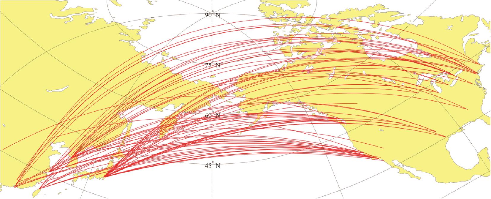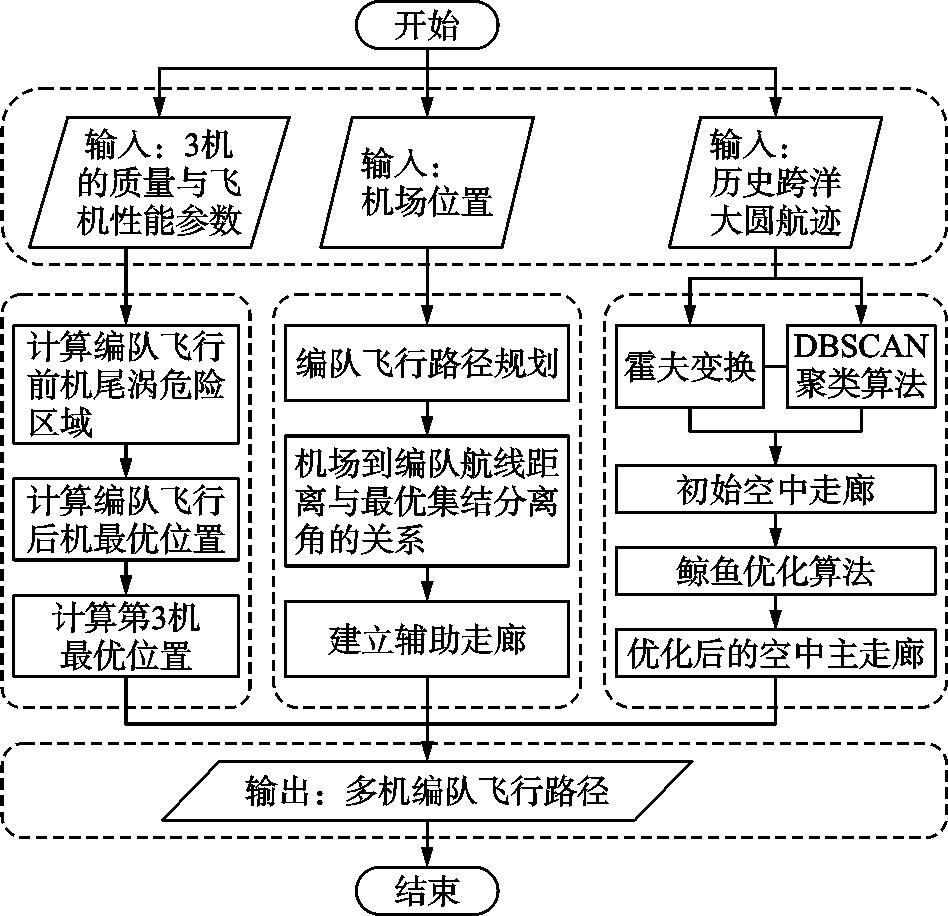 摘要:编队飞行可以有效减少飞机运行成本,增加空域容量。以三机编队为研究对象,首先确定了3号机在编队中的危险区域和最优位置。然后基于飞机性能和粒子群算法,提出了不改变1号和2号机路径的3号机编队方案,揭示了3号机起降机场位置对编队集结点、分离点的影响规律。最后以霍夫变换和DBSCAN(Density-based spatial clustering of application with noise)聚类算法处理大圆航线,得到作为初始解的空中走廊,然后使用鲸鱼优化算法进行优化,并建立辅助走廊,为大规模编队路径规划问题提供了可行的方案。研究表明:3号机与1号机的纵向距离为6 000 m时,3号机的编队最优位置在横向距离-57 m或114 m处,3号机的最优位置受到1号机和2号机质量的影响;当3号机起飞机场或着陆机场与编队航线所在大圆的距离不变时,最优集结角或最优分离角基本不变。以827个跨太平洋航班为例,通过霍夫变换和DBSCAN聚类,得到了5条空中走廊。在起飞和着陆机场与空中走廊的距离阈值为300 km时,可使用走廊的航班百分比达到了54.17%。经过鲸鱼算法的优化,百分比增加至64.33%。