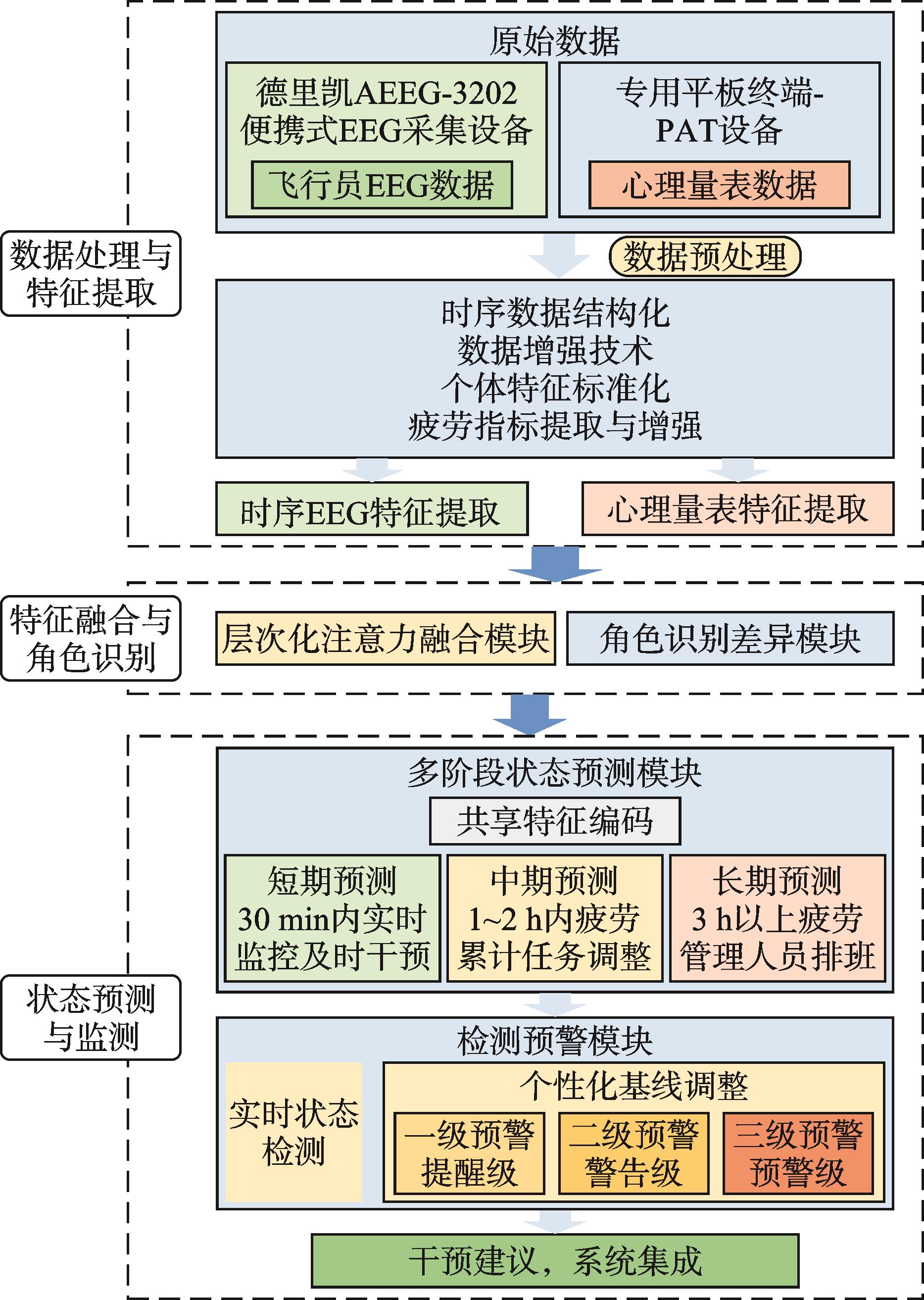 摘要:为提高机组疲劳预测精度并实现异常行为早期预警,本研究提出了一种基于时序卷积网络和长短期记忆网络(Temporal convolutional network-long short-term memory,TCN-LSTM)与层次化注意力机制的机组疲劳状态预测方法。通过多尺度时序特征提取模块捕捉脑电(Electroencephalography, EEG)信号的时频特征与长期依赖关系,利用层次化注意力机制融合脑电与心理量表数据,并针对操纵飞行员和监控飞行员设计差异化预测策略。实验结果表明,该方法较单一模态预测模型提升15.3%的预测精度,预警时间窗提前至12.5 min。其中,TCN-LSTM混合网络的时序特征提取效率较常用LSTM网络提升22.7%,层次化注意力机制使多模态融合效能提高18.4%。该混合架构在预测时效性与准确性方面均优于单一深度学习模型,适用于航空人因工程的实时监测。
